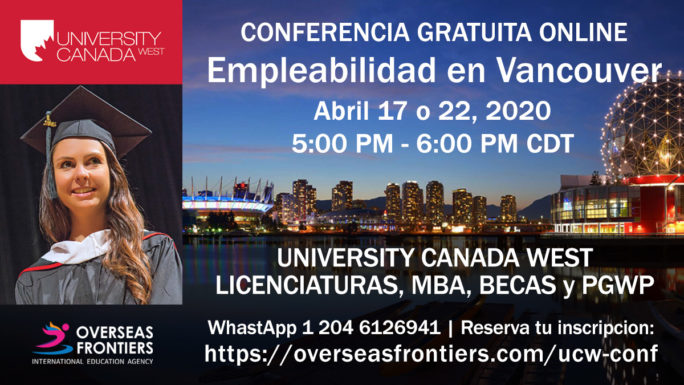 Tuvimos el gusto de tener en nuestras conferencias online en Abril 17 o 22 de 2020 a nuestra invitada especial Karla Quevedo como representante de la Universidad Canada West de Vancouver quien hablo sobre “Empleabilidad en Vancouver” y su servidora Carmen Zelaya directora de la Overseas Frontiers que hablo sobre como Overseas Frontiers te puede ayudar con la matricula en UCW con consultoria gratuita.