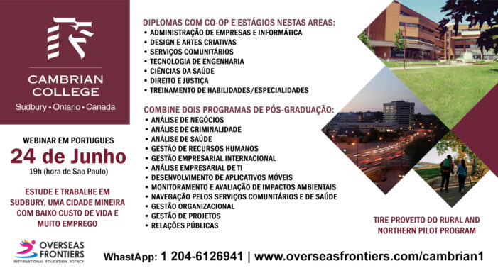 Cambrian College e Overseas Frontiers convidam você para um webinar em português no dia 24 de junho às 19h (horário de São Paulo), sobre estudar e trabalhar em Sudbury, Ontário. Sudbury é uma cidade mineira com baixo custo de vida e muito emprego. Tire proveito do “Rural and Northern Pilot Program”. Participe e descubra mais sobre os programas de diploma e combinações de pós-graduação com os quais você pode ganhar 3 anos de PGWP.