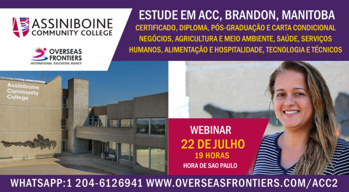 Assiniboine Community College e Overseas Frontiers convidam você para nosso Webinar em portugues no dia 22 de julho às 19 h (horário de Sao Paulo). ACC localizado em Brandon, MB, oferece cursos tecnicos de 1 ano, diploma de 2 anos e pós-graduação de 1 ano, com carta condicional se for necessário.