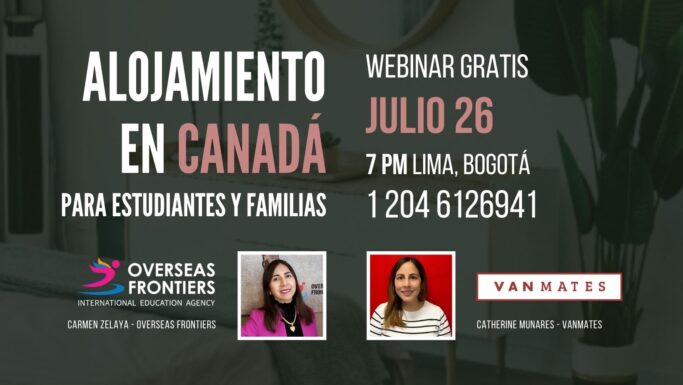 Overseas Frontiers y Vanmates webinar, descubra cuánto le puede costar el alojamiento en Canadá. Vanmates ofrece 3 tipos de alojamiento: Homestay, Rentar habitación o Cambio de provincia. Si quieres venir como estudiante con tu familia, podemos ayudarte con consulta y matricula gratuita en una de las 40 instituciones que representamos en todo Canada que ofrecen PGWP. Para más información llena este formulario abajo: Click aqui para el link de zoom del webinar.