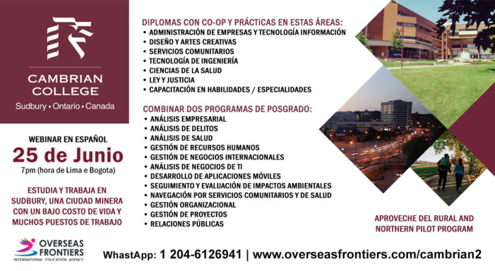 Cambrian College y Overseas Frontiers lo invitan a un seminario web en español el 25 de junio a las 7:00 pm (hora de Lima y Bogotá) sobre estudiar y trabajar en Sudbury, Ontario. Sudbury es una ciudad minera con un bajo costo de vida y mucho empleo. Aproveche el “Rural and Northern Pilot Program” . Participe y obtenga más información sobre los programas de diploma y las combinaciones de posgrados con los que puede obtener 3 años de PGWP.