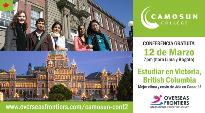 Camosun College (celebra sus 50 anos) y Overseas Frontiers te invitan a la conferencia sobre “Estudiar en Victoria, British Columbia” a realizarse el dia 12 de Marzo, 2021 a las 7pm (hora de Lima). Victoria tienen el mejor clima y costo de vida en Canadá y Camosun recibe 19,000 estudiates por ano y ofrece mas de 160 programas. Overseas Frontiers te ayuda con la matricula y consulta gratuita