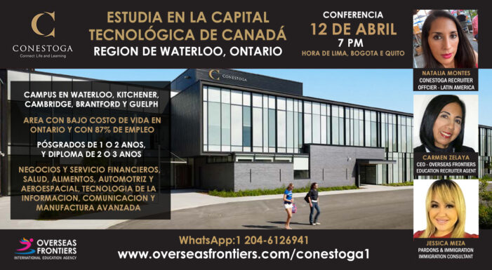 Conestoga College and Overseas Frontiers invite you to a webinar on the “Study in Canada’s Tech Capital” region of Waterloo, Ontario. Free webinar on April 12 at 7:00 p.m. (Lima, Bogotá, and Quito time). Advance technology, cooperative programs in the Waterloo region with low cost of living and 85% of employability. Graduates from 1 to 2 years and diplomas from 2 to 3 years.