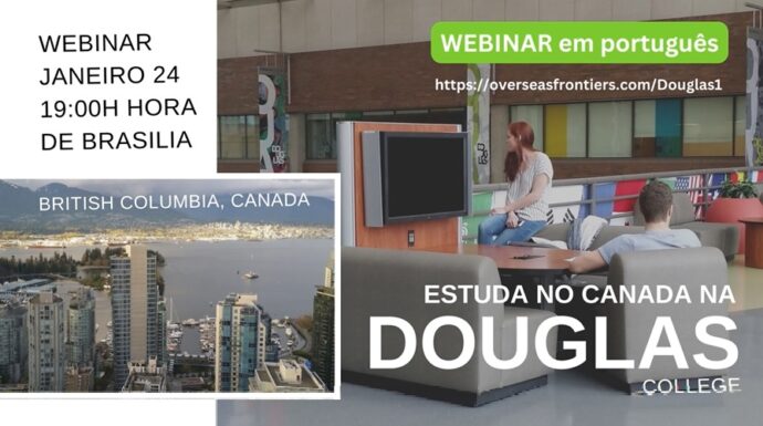 Douglas College e Overseas Frontiers te convidam para o Webinar em português sobre Douglas College localizado em British Columbia, Canadá, apenas 30 ou 40 min de Vancouver. Oferece cursos de graduação e pós-graduação de 1, 2 ou 4 anos com PGWP. Webinar dia 24 de janeiro às 19h. Te esperamos se registra aquim ou no zoom para este webinar: