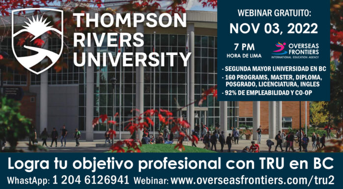 Thompson Rivers University y Overseas Frontiers te invitan para el webinar gratuito del dia 3 de noviembre a las 7pm (hora de Lima, Bogota), Esta uni