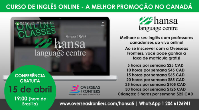Hansa Languages e Overseas Frontiers está convidando você para um webinar a ser realizado em 15 de abril de 2021 às 19h (Horário de Brasília). Melhore o seu inglês com professores canadenses ao vivo online! Ao se inscrever com a Overseas Frontiers, você pode ganhar a taxa de matricula gratis! Aproveite os melhores precos de curso de ingles online no Canada.
