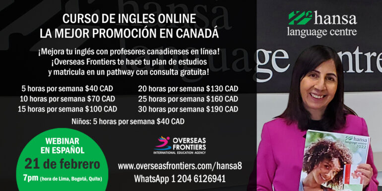 Regístrese en este webinar para conocer más sobre la promoción Hansa Language Center, webinar el 21 de febrero a las 7pm (hora de Lima y Bogota). Hansa ofrece la mejor promoción en Canadá de curso de ingles y con prueba gratuita de nivel. ¡Mejora tu inglés con profesores canadienses en línea! ¡Overseas Frontiers te hace tu prueba de nivel gratis con Hansa e prepara tu plan de estudios y te matricula en un pathway con consulta gratuita!