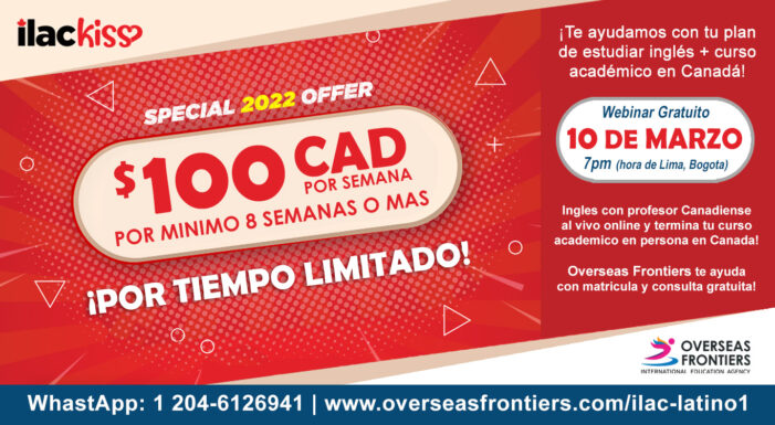 ILAC y Overseas Frontiers te invitan al webinar el 10 de marzo a las 7pm (hora de Lima, Bogotá y Quito). ILAC es la escuela de inglés más famosa de Canadá, donde puedes tomar cursos de inglés general, inglés de negocios, preparación para el IELTS y pathway. Ilac tiene convenio con más de 80 instituciones de educación superior a lo largo de Canadá y la promoción del momento es para English KISS online, si haces más de 8 semanas solo pagas $100 CAD por semana. !Aprovecha esta promoción por tiempo limitado! Overseas Frontiers lo ayuda con consulta gratuita, con pathway mas el registro en ILAC. Póngase en contacto con Overseas Frontiers: