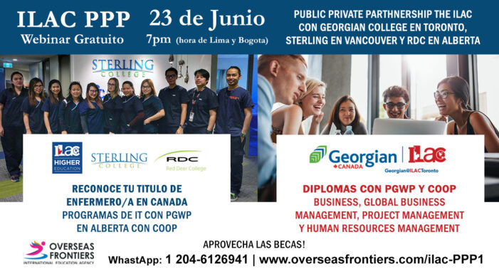 Ilac PPP (Public Private Partnership) ofrecerá este webinar gratuito en español el 23 de junio de 2021. Ilac PPP en asociación con Georgian College en Toronto, Sterling en Vancouver y RDC en Alberta ofrecen programas para estudiantes internacionales con PGWP y Co-op (pasantías para graduarse). Además, Ilac PPP ofrece becas de ingreso entre $ 1,000 y $ 3,000 CAD por año.