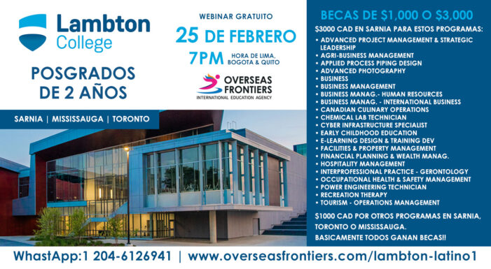 Lambton College y Overseas Frontiers te invitamos para la conferencia virtual el dia 25 de febreo a las 7pm (hora de Lima). Lambton College es la #1 en posgrados de 2 años en Canada y esta ahora ofreciendo BECAS para Latinos. Son becas entre $3,000 a $1,000 CAD. Lambton es uno de los lideres en research o investigación en Canada y casi todos los programas tienen co-op (practicas en empresa). Posee 3 campos en Ontario: Sarnia, Mississauga e Toronto y ofrece mas de 100 Posgrados.