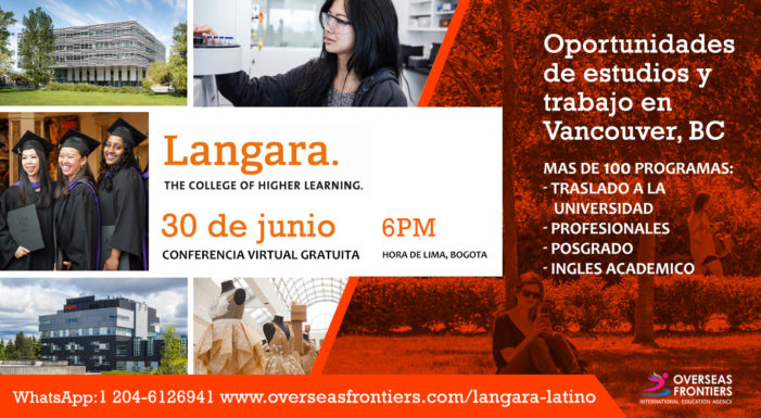 Langara College y Overseas Frontiers lo invitan a la conferencia sobre: Estudio y oportunidades de trabajo en Vancouver (BC, Canadá). El dia 30 de junio a las 6PM.