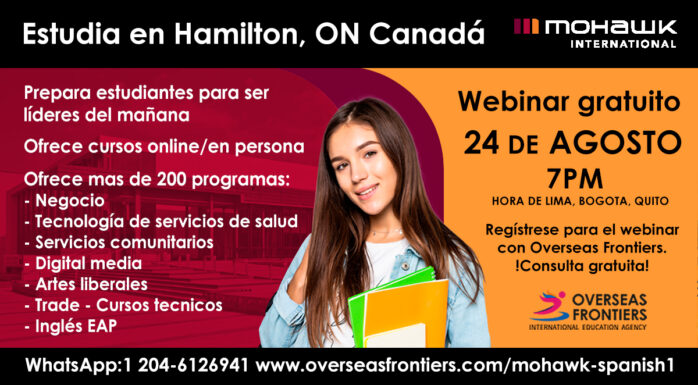 Mohawk College and Overseas Frontiers te invitan a participar del webinar gratuito sobre Mohawk College el dia 24 de agosto a las 7pm. Mohawk College esta localizado en Hamilton, ON a 1 hora de Toronto, prepara estudiantes para que sean lideres del mañana. Mas info en este PDF