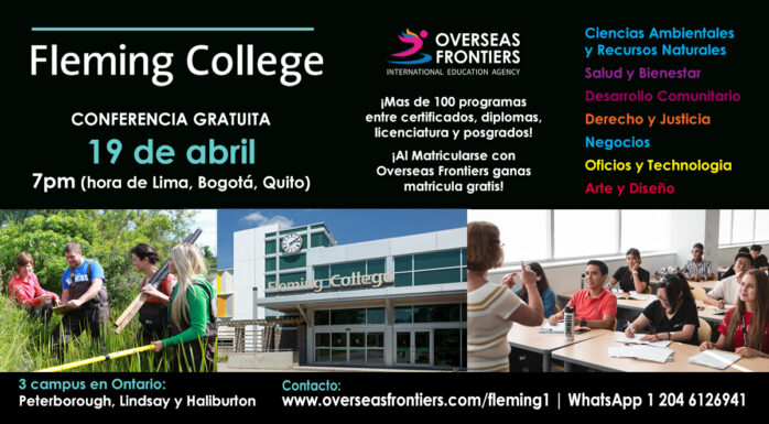 Fleming College y Overseas Frontiers te invitan al webinar gratuito para latinos a realizarse el día 19 de abril a las 7pm (hora de Lima, Bogota y Q