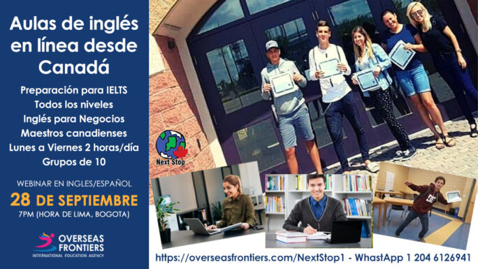 Overseas Frontiers y Next Stop English School te invitamos al webinar del dia 28 de septiembre a las 7pm (hora de Lima y Bogota). Esta escuela localizada en Stainbach, Manitoba ofrece cursos en linea: Preparación para el IELTS, Inglés general para todos los niveles, Inglés para negocios con maestros canadienses de lunes a viernes (2 horas por día) grupos de 10 personas.