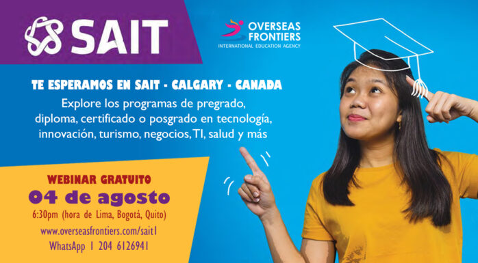 SAIT Polytech y Overseas Frontiers te invitan para el webinar gratuito el 04 de agosto a las 6:30pm (hora de Lima, Bogotá, Quito). Explore los programas de pregrado, diploma, certificado o posgrado en tecnología, innovación, turismo, negocios, TI, salud y más. Overseas Frontiers te hace tu plan de estudios y la matricula con consulta gratuita. No te pierdas el webinar. Te esperamos!