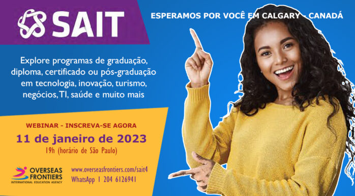 A SAIT e a Overseas Frontiers convidam você para o webinar no dia 11 de janeiro, às 19h (horário de São Paulo). Sait localizada em Calgary, Alberta, Canadá; oferece programas de graduação, diploma, certificado ou pós-graduação em tecnologia, inovação, turismo, negócios, TI, saúde e muito mais. A Overseas Frontiers faz seu cadastro com consulta gratuita. Inscreva-se agora!