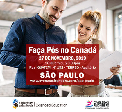 Palestra gratuita em Sao Paulo no dia 27 de novembro da University of Manitoba com a Overseas Frontiers sobre “Faça Pós no Canadá”. Recomendamos que o participante tenha um diploma ou degree de nível superior e experienca professional em negocios.