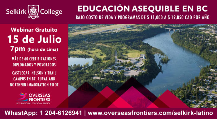 Selkirk college y Overseas Frontiers te invitan para la conferencia sobre Selkirk College el dia 15 de julio a las 7:00pm (hora de Lima, Bogota, Quito). Te esperamos.