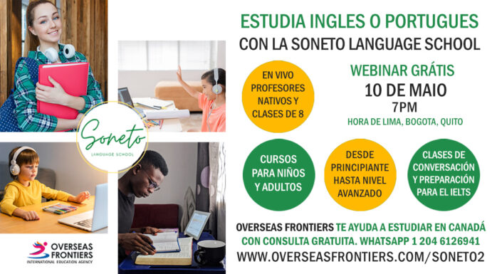 Soneto Language School and Overseas Frontiers se complace en invitarlo al seminario web el 10 de mayo a las 7pm (hora de Lima, Bogota y Quito). Soneto y una escuela de idiomas ubicada en Winnipeg ofrecen cursos de inglés y portugués para niños y adultos con clases en vivo con profesores nativos y clases de 8 personas. Te prepara desde el nivel principiante hasta el avanzado y también ofrece clases de conversación y preparación para IELTS. Overseas Frontiers lo ayuda con la inscripción en una escuela secundaria, facultad o universidad en Canadá, contáctenos para una consulta gratuita