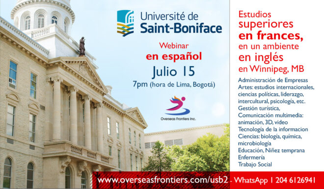 St. Boniface University y Overseas Frontiers lo invitan al webinar en español el 15 de julio a las 7:00 pm (hora de Lima, Bogota). Estudia un curso de educación superior en francés en un entorno inglés en Winnipeg, MB. USB ofrece cursos de pregrado, diploma y posgrado. Programas de $ 13.000 CAD por ano, e você pode se inscrever para bolsas de estudo no segundo ano. Para la matricula en USB necesita tener B2 en francés.